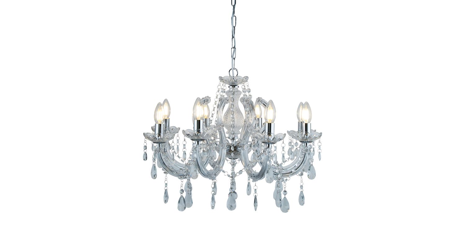 The spectacular, glittering Marie Therese 8 light chandelier with a polished chrome finish has an aristocratic style, perfect for adding a theatrical touch to any large room. A traditional design with a modern twist, this ceiling pendant is luxuriously adorned with acrylic drops, barley twist arms and glass trimmings that adds a glamorous focal point to any interior. Height adjustable, this 8LT pendant can be adapted to any ceiling height. 1200mm H x 610mm W x 610mm L 1200mm Total Height Bulb Type- E14 Not Included