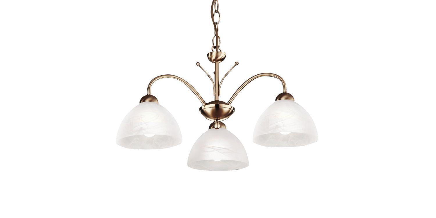 The Milanese antique brass 3 Pendant with alabaster glass is beautiful and classic. The sleek fitting has a decorative metal centrepiece, with traditional antique brass finish curved arms leading onto three downward facing alabaster glass shades. This fitting can be suspended from a chain or fitted flush to the ceiling to create the desired effect. 1200mm H x 560mm W x 560mm L 1200mm Total Height Bulb Type- E14 Not Included