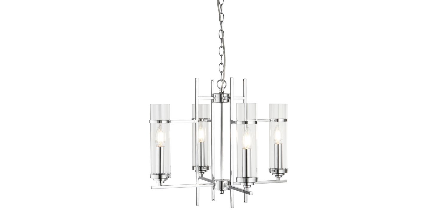 This Milo chrome Pendant with clear glass cylinder shades makes a stylish centrepiece for any room. The sleek chrome finish fitting has right angled arms and spokes leading off the central mast, with four beautifully designed cylindrical glass shades. The shades contain candle style light fittings that provide a bright source of light, and the chain suspension can be adjusted to the perfect ceiling height. 1200mm H x 490mm W x 490mm L 1200mm Total Height Bulb Type- E14 Not Included