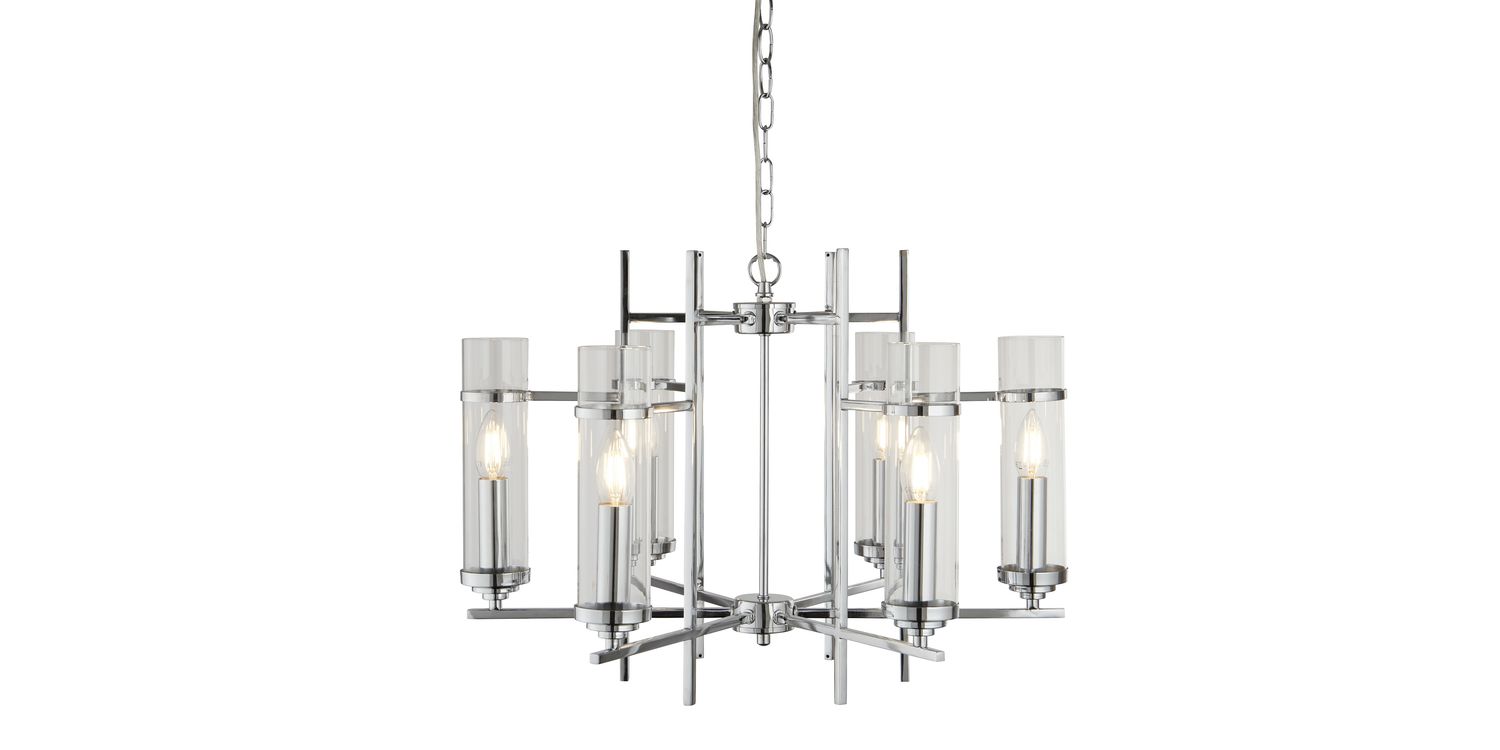This Milo 6 light chrome Pendant with clear glass cylinder shades makes a stylish centrepiece for any room. The sleek chrome finish fitting has right angled arms and spokes leading off the central mast, with four beautifully designed cylindrical glass shades. The shades contain candle style light fittings that provide a bright source of light, and the chain suspension can be adjusted to the perfect ceiling height. 1200mm H x 595mm W x 595mm L 1200mm Total Height Bulb Type- E14 Not Included