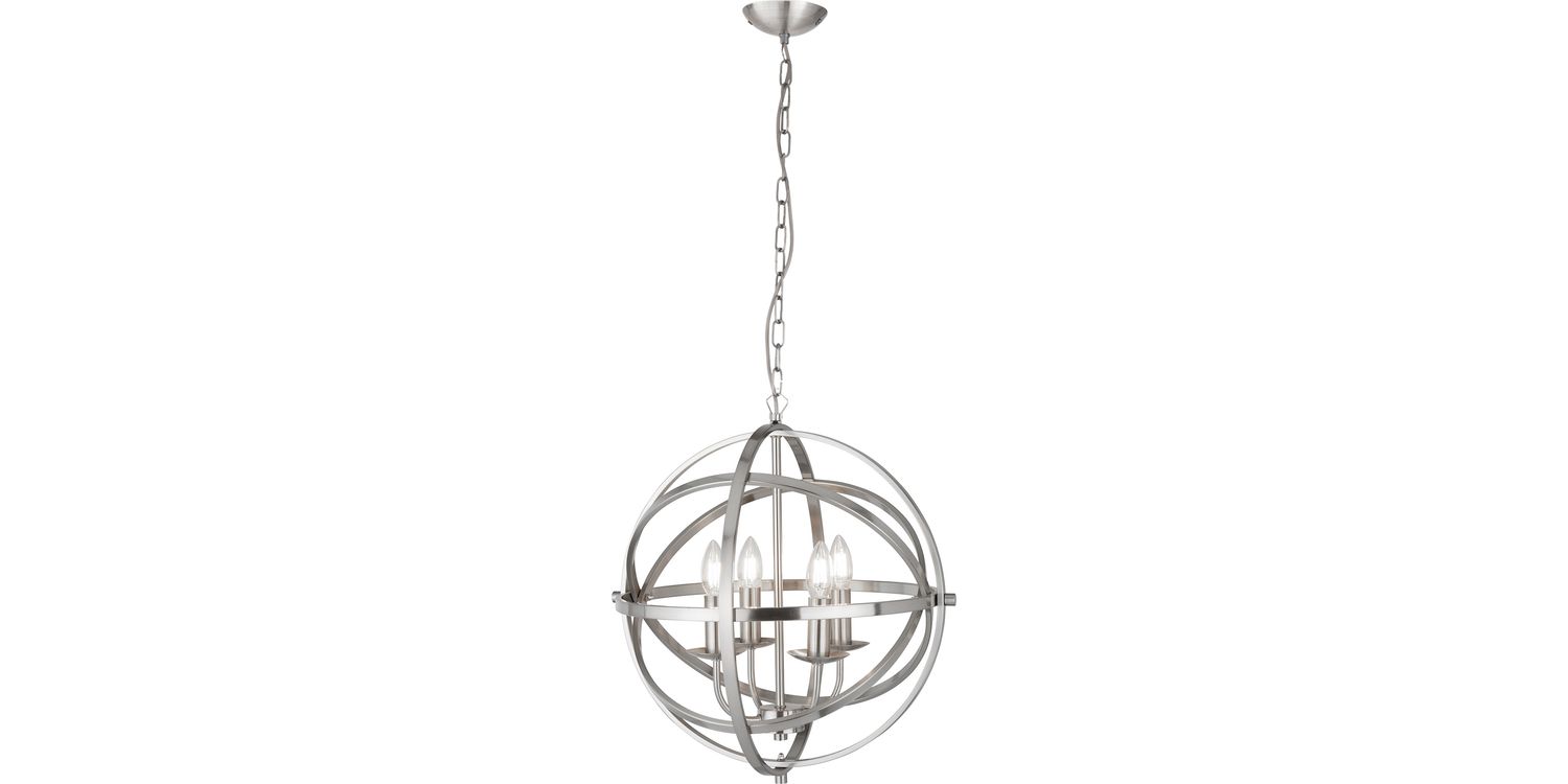 Update your interiors with this truly unique Orbit pendant light in satin silver. This pendant encompasses a cage frame that contains four vintage inspired candle lights. The pendant is available in a satin silver finish to give it a stylish edge. Use this special feature for meeting rooms or modern offices. 1200mm H x 450mm W x 450mm L 1200mm Total Height Bulb Type- E14 Not Included