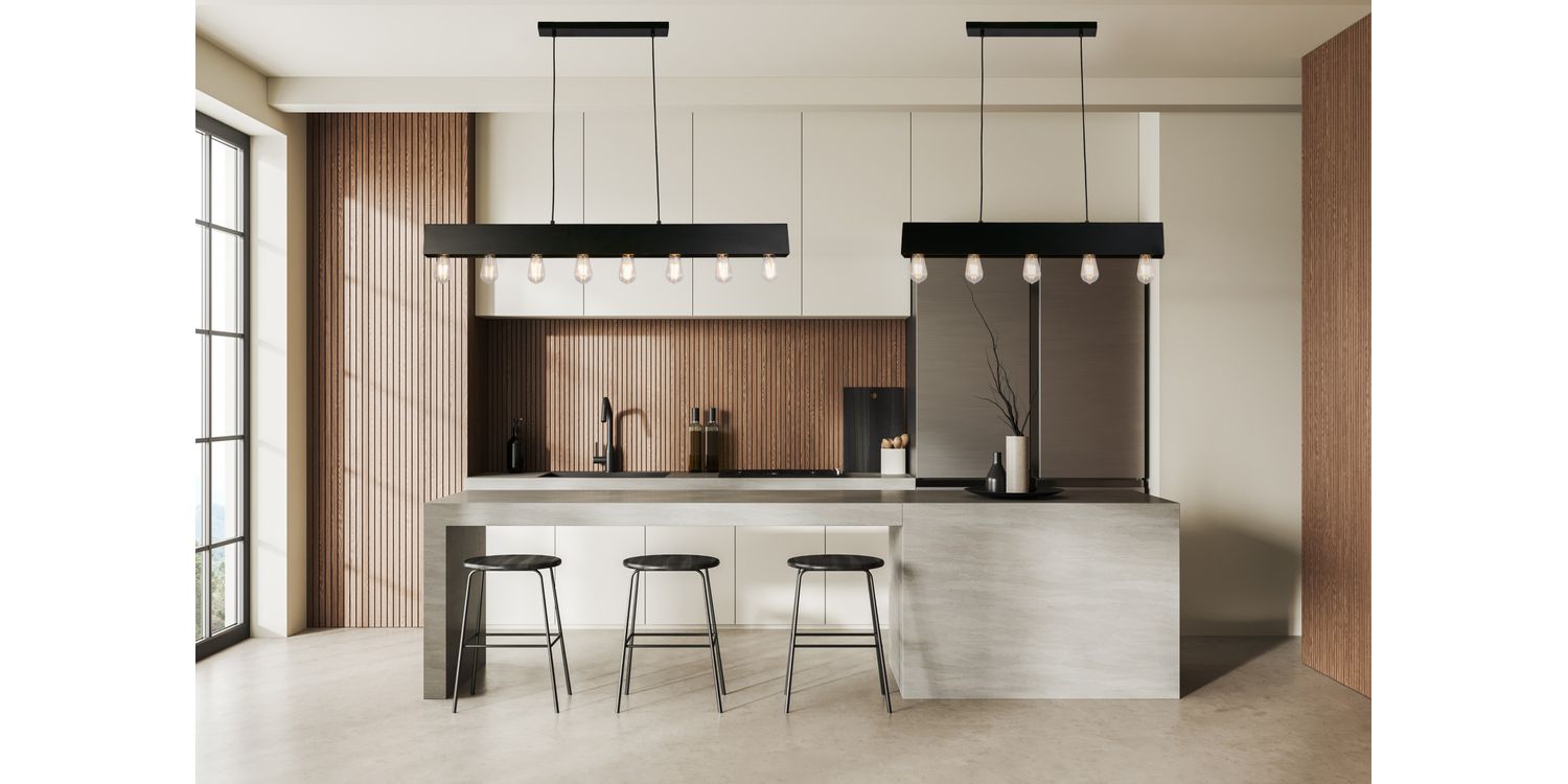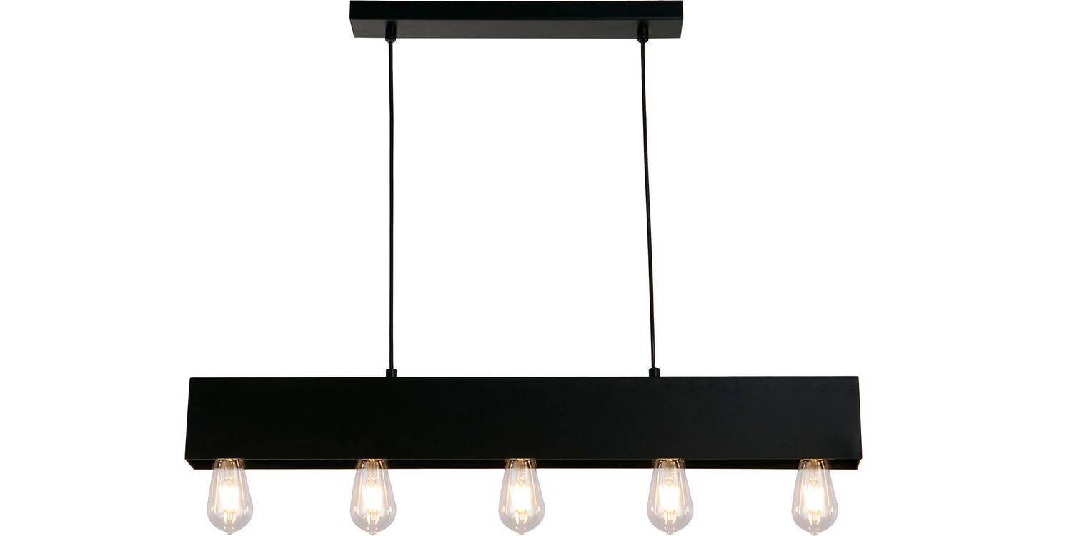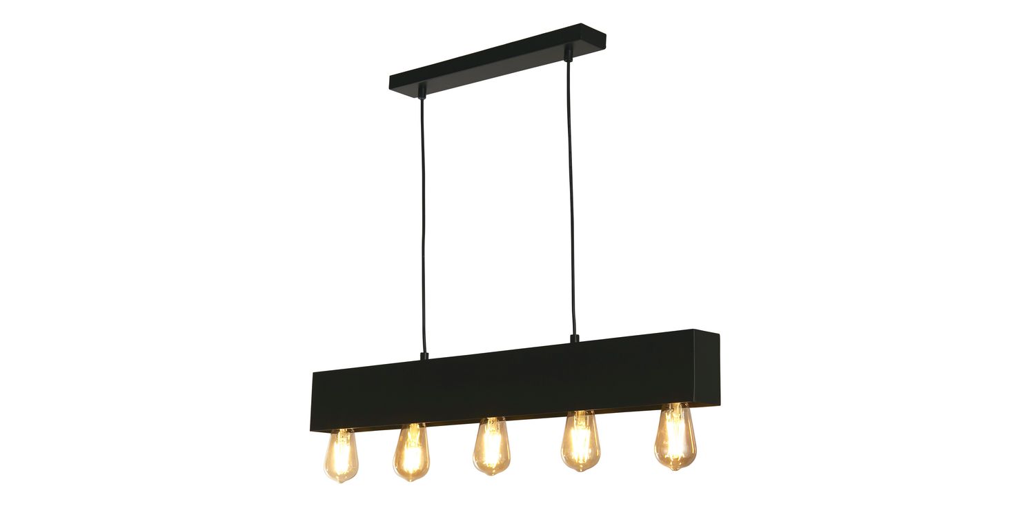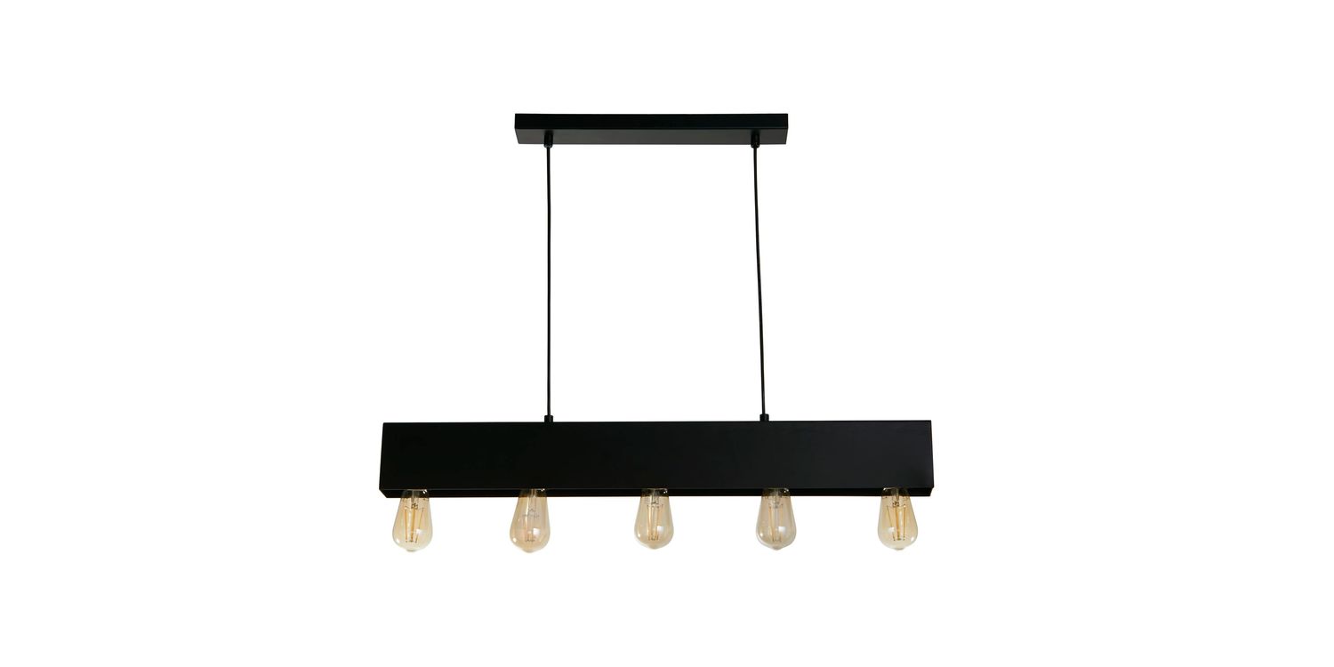 The Piano 5Lt Diner Bar Pendant will be a stunning addition to any home. Crafted from durable mild steel, this pendant features a striking black finish, adding an air of sophistication to any space. Whether suspended above a breakfast bar or dining table, this bar pendant will be a captivating focal point to any room.. The sand black bar, is adjustable in height, and hangs from a rectangular ceiling plate, showcasing the exposed bulbs. The look of this pendant can be altered by changing the lamps, see our range of decorative lamps for some inspiration! 1200mm H x 70mm W x 800mm L 1200mm Total Height Bulb Type- E27 Not included