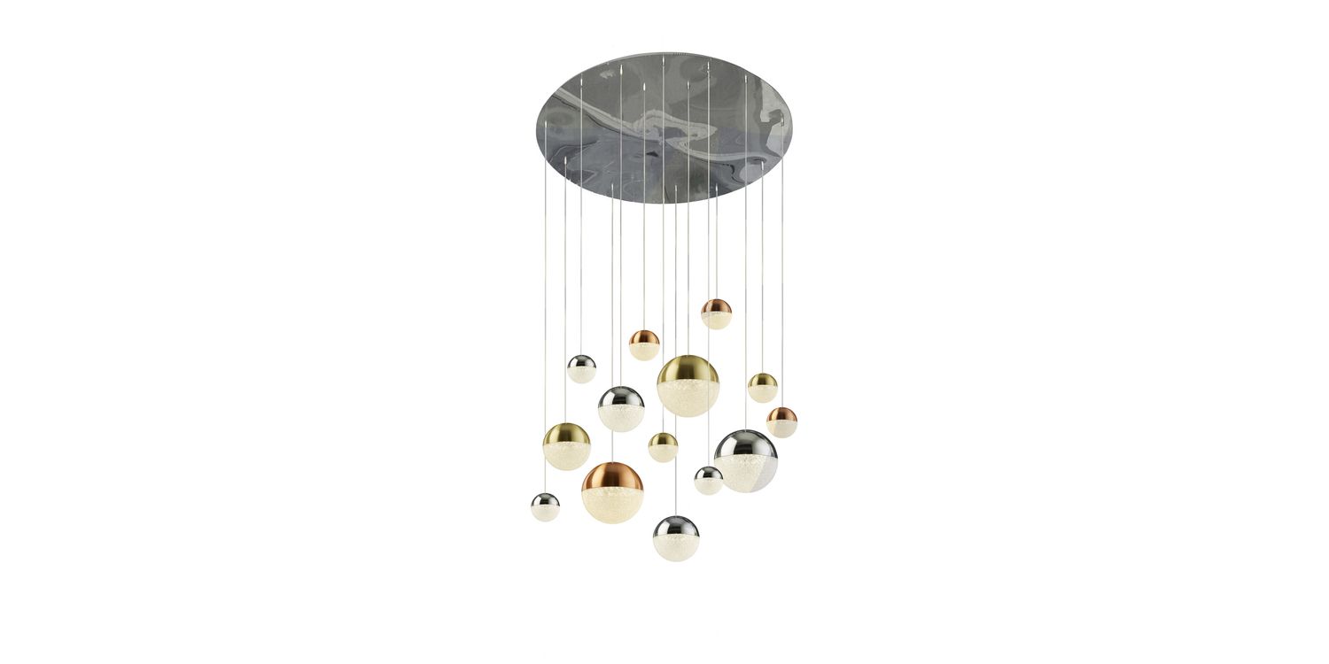 The Planets pendant has a rounded chrome ceiling plate that holds 14 Multi-drop balls with copper, chrome and satin brass finish; also Detailed with crystal sanded shades. The integrated LED pendant also features a height adjustable cable and dimmer switch. LED's use up to 75% less energy and last up to 20 times longer than incandescent bulbs. 3000mm H x 700mm W x 700mm L 3000mm Total Height Bulb Type- LED Intergrated