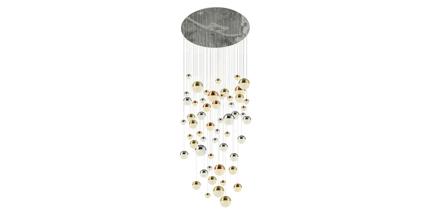 The stunning Planets pendant has a rounded chrome ceiling plate that holds 55 stunning Multi-drop balls with copper, chrome and satin brass finish; then detailed with crystal sanded shades. Planets will add a statement to any high ceiling room with its visual impact. The integrated LED pendant also features a height adjustable cable and dimmer switch. LED's use up to 75% less energy and last up to 20 times longer than incandescent bulbs.