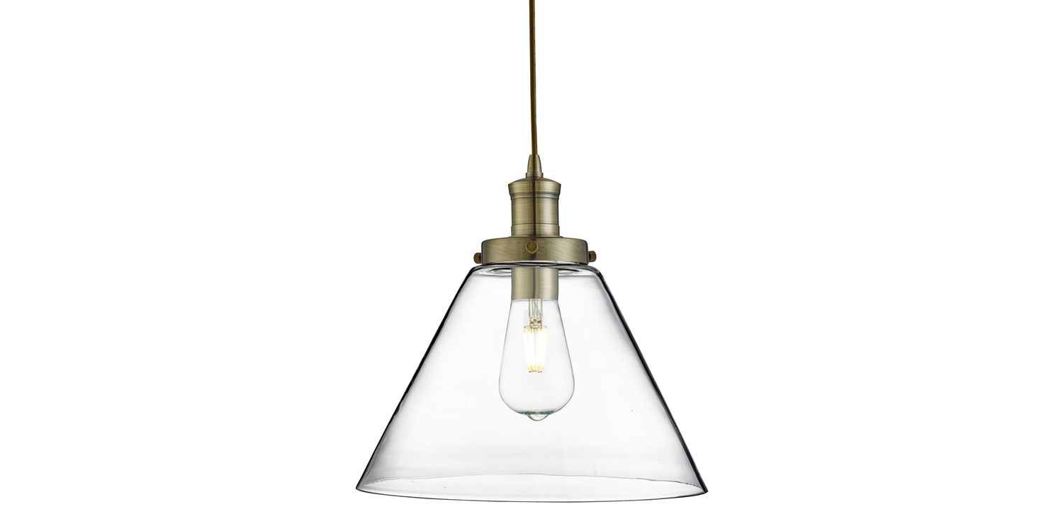 This Pyramid antique brass pendant light with domed clear glass shade is classic design at its best. Instead of hiding all the components away, the pyramid pendant light makes a feature of them, giving this exposed fitting an urban industrial vibe, perfect for today's contemporary kitchens or dining rooms. The clear glass shade has a traditional antique brass finish top leading up to a cable suspension, which is fully adjustable for different ceiling heights. 1200mm H x 290mm W x 290mm L 1200mm Total Height Bulb Type- E27 Not included