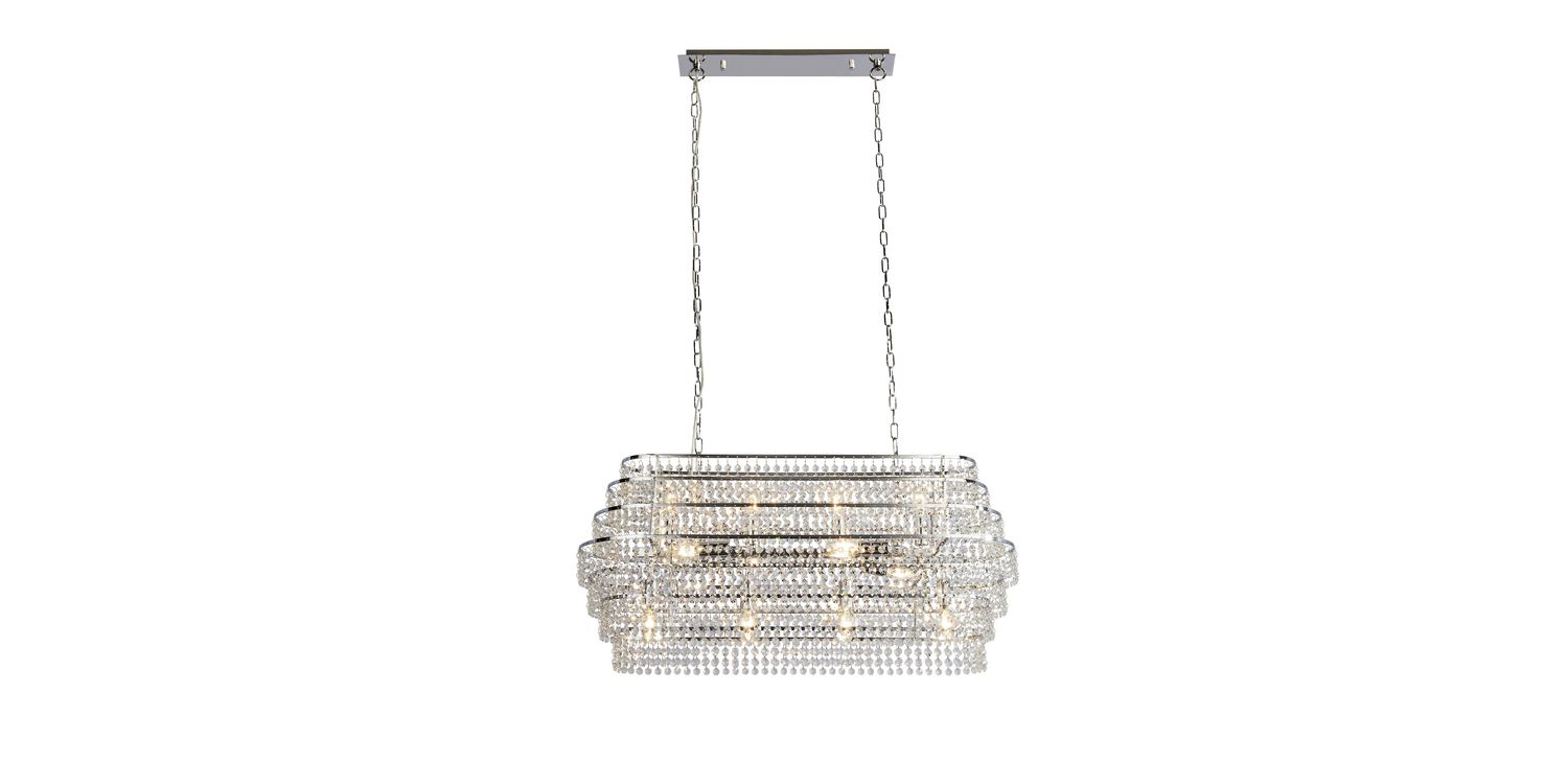 There is nothing understated about the Rene bar pendant. Consisting of hundreds of clear crystal glass droplets cascading from a chrome frame, the light from the 12 candle bulbs will shimmer and dazzle anyone lucky enough to be sat around your dining table. Hung easily with a single bar and adjustable chains you get maximum impact for minimum effort. 2000mm H x 300mm W x 900mm L 2000mm Total Height Bulb Type- E14 Not Included