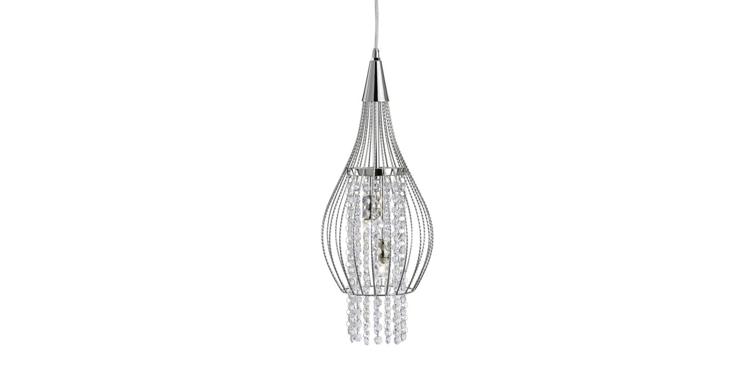 This Rocket chrome 2 light cage frame pendant with clear crystal buttons is both sophisticated and fun. The rocket shape fitting has a stylish cage finished in chrome, with clear crystal buttons and trimmings providing the "thrust". And when the two lights turn on, the rocket sparkles beautifully. The wire suspension can easily be adjusted for different ceiling heights. 1200mm H x 190mm W x 190mm L 1200mm Total Height Bulb Type- G9 Not Included