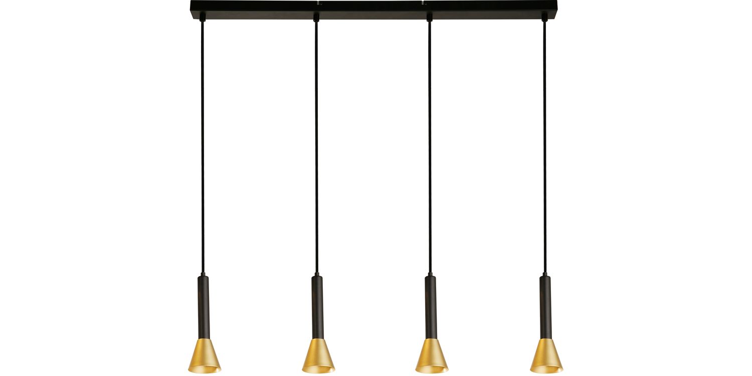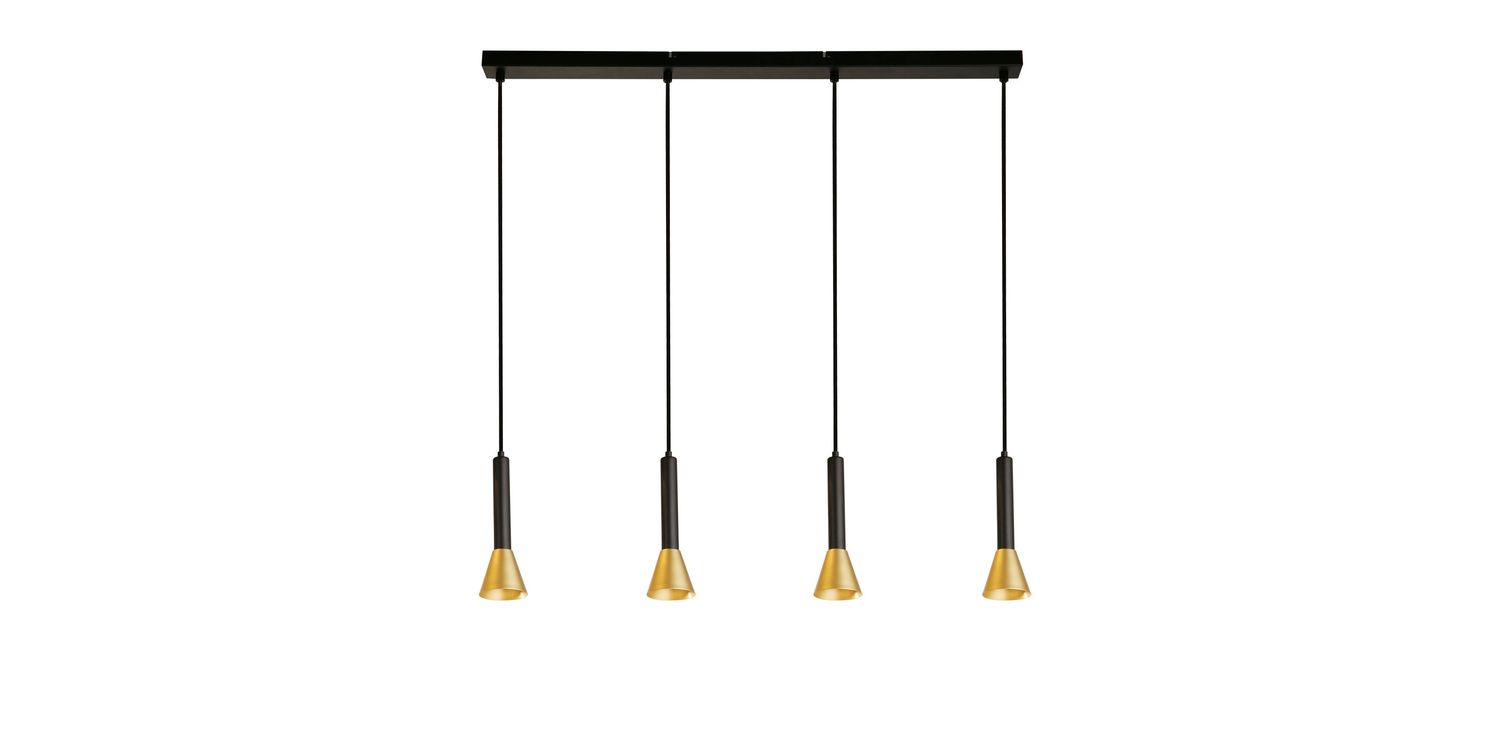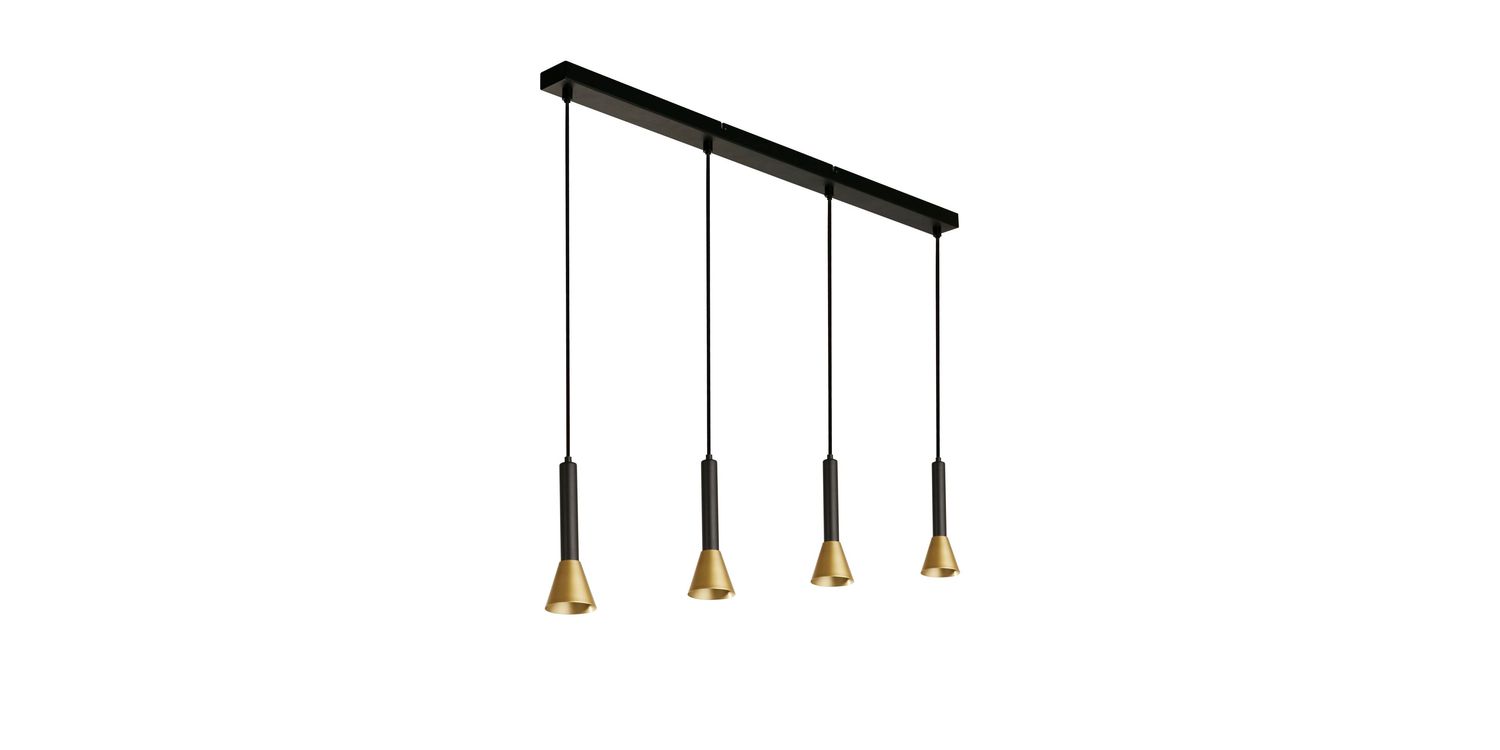 The Signal 4Lt Bar Pendant effortlessly combines style and functionality. Crafted from black and gold metal, this bar pendant features cone-shaped shades in a powder-coated satin finish, creating a sleek and elegant look. The height-adjustable design allows for customisation, making it suitable for various room sizes and ceiling heights. With directed light and efficient distribution, it provides focused illumination while minimising glare. 1500mm H x 840mm W x 90mm L 1500mm Total Height Bulb Type- GU10 Not Included