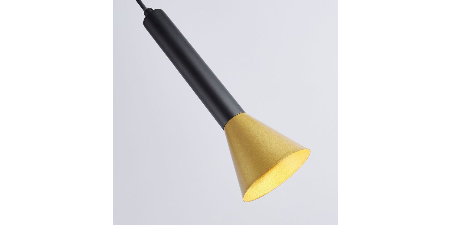 A beautiful lighting option for any room is the Signal Pendant in black and gold. It delivers focused illumination and draws attention to particular areas with its height-adjustable black suspension and contrast gold cone shade. Its powder-coated satin construction perfectly blends classic and modern components. It's a great option for dining tables, kitchen islands, or reading nooks and is ideal for spotlighting important design aspects or fostering a cosy atmosphere. 1500mm H x 90mm W x 90mm L 1500mm Total Height Bulb Type- GU10 Not Included