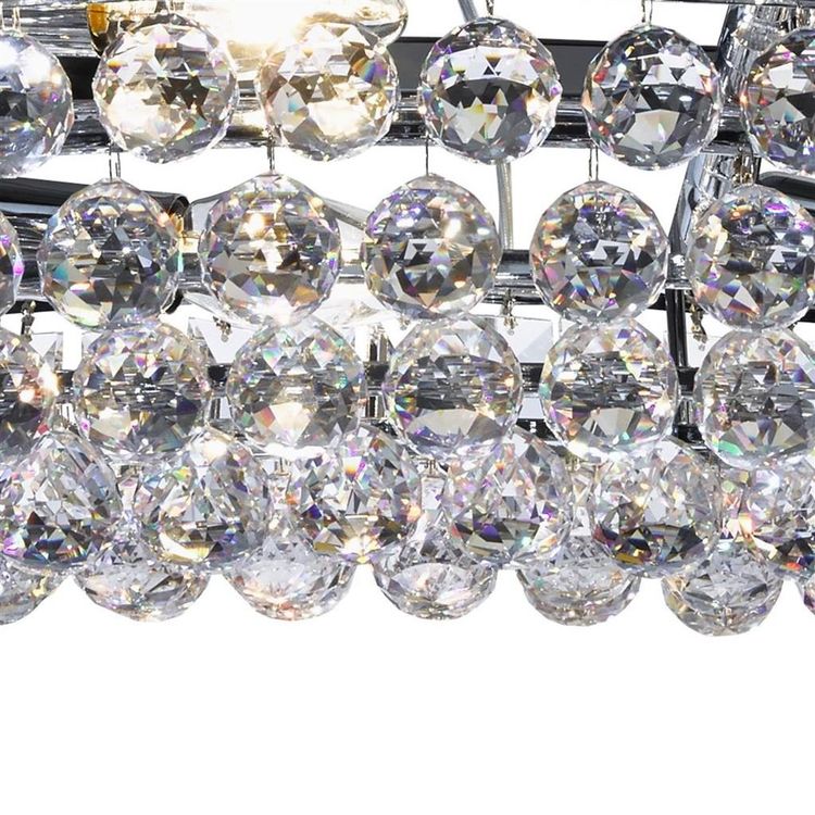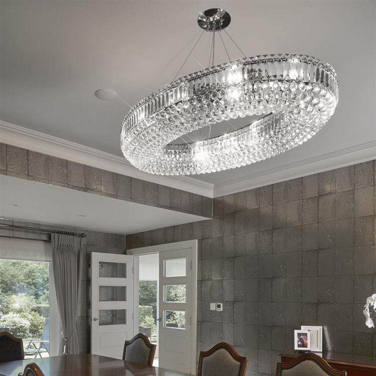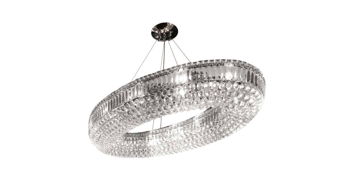 This Vesuvius oval 24 light pendant will make an amazing impact in any room. The majestic, contemporary oval pendant is a real statement piece which features a decorative hollow oval of crystal coffin drops and balls, with 24 lights that make the entire piece sparkle when lit. Height adjustable to adapt to different ceiling heights, this focal pendant will be the perfect focal point for any room in the home. 1200mm H x 730mm W x 1230mm L 1200mm Total Height Bulb Type- E14 Not Included