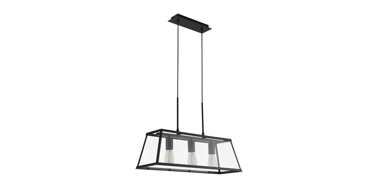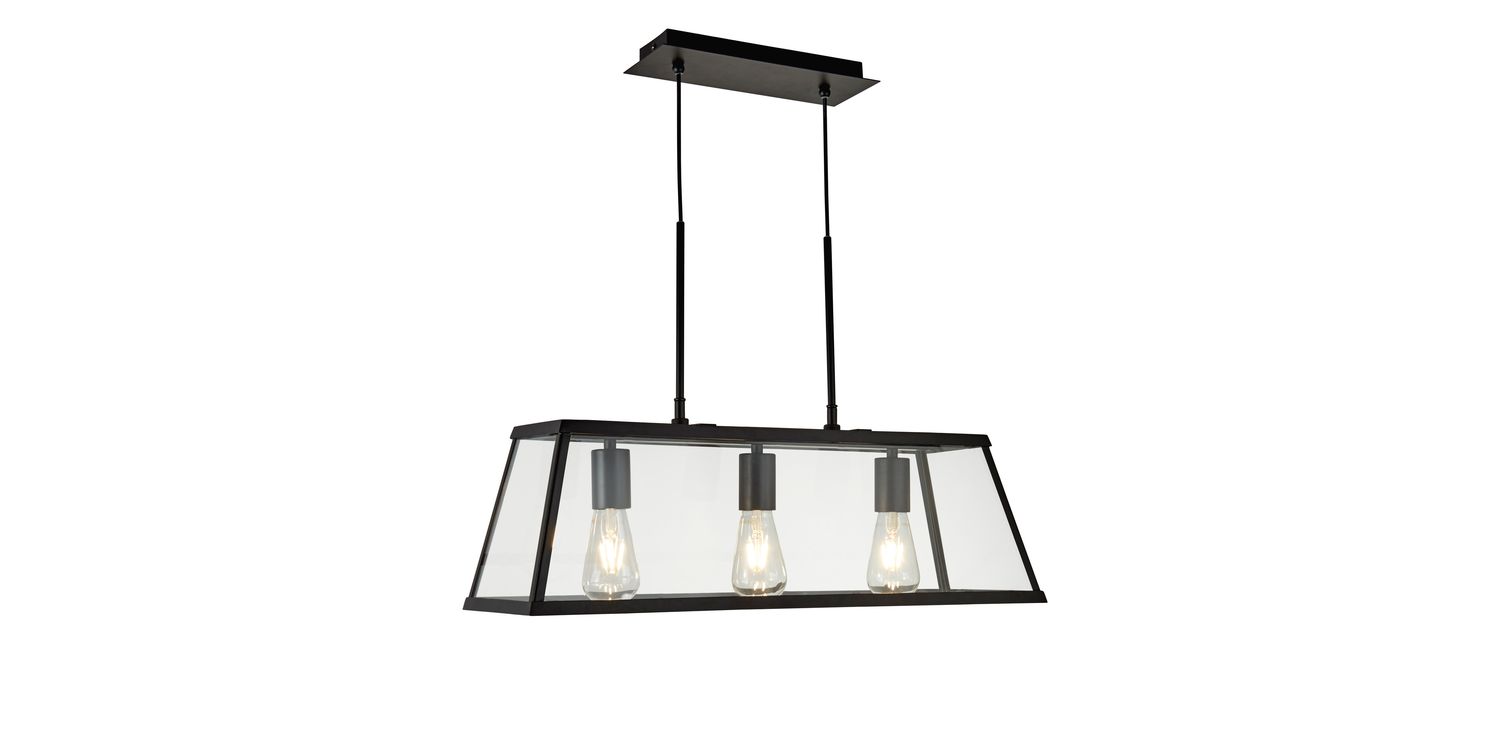 The Voyager 3 light bar pendant is a simple way to elevate any room. Whether hung low over a kitchen island or dining table, or in a living room or hallway, this bar pendant will work with both contemporary and more traditional interior styles. The prism shaped black metal frame is encase by clear glass, allowing the 3 exposed black metal lamp holders to be visible. Height adjustable, but can also be fully convertible to flush to create a 2-in-1 design to suit any room or ceiling height. 1200mm H x 200mm W x 650mm L 1200mm Total Height Bulb Type- E27 Not included