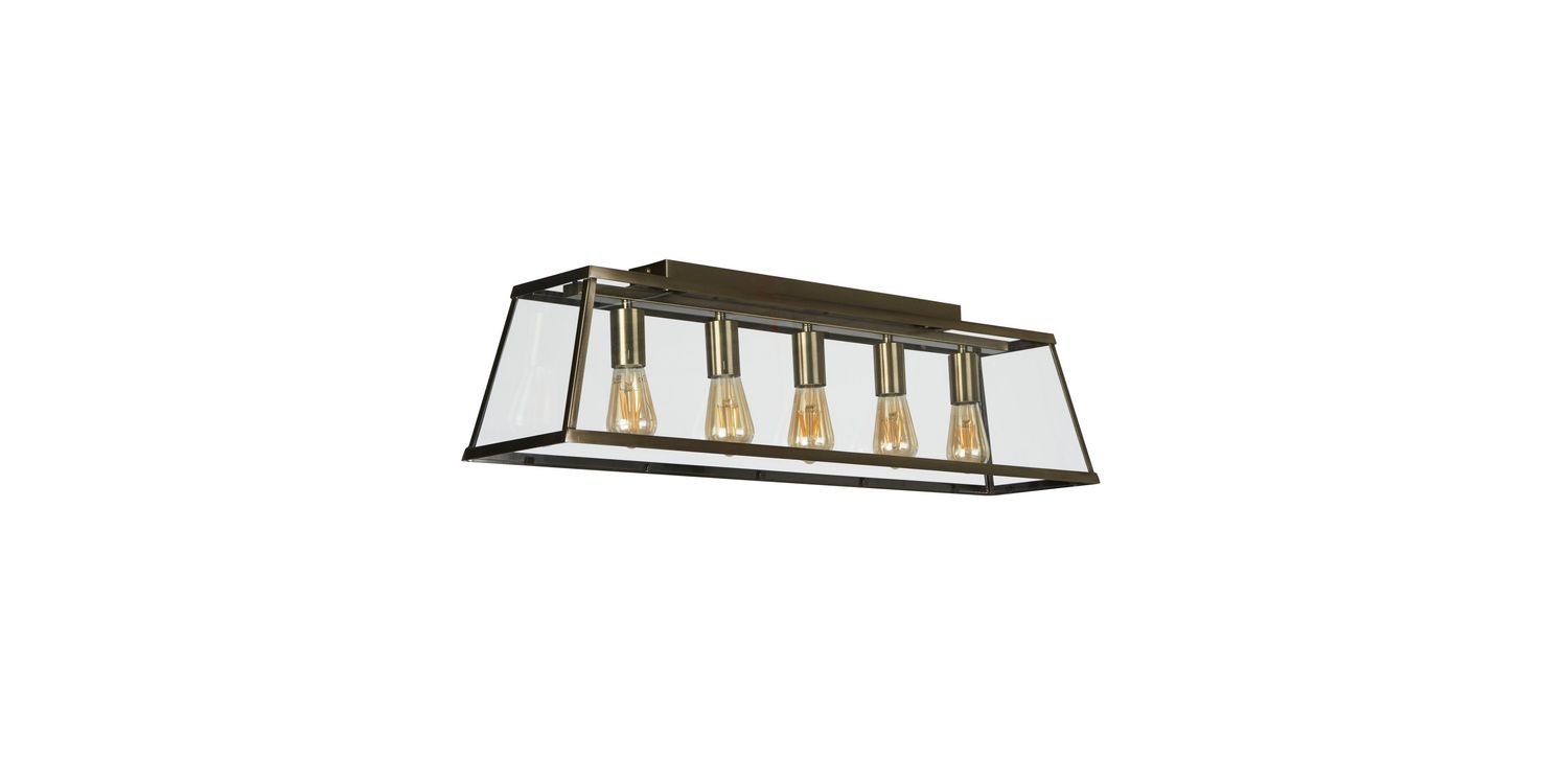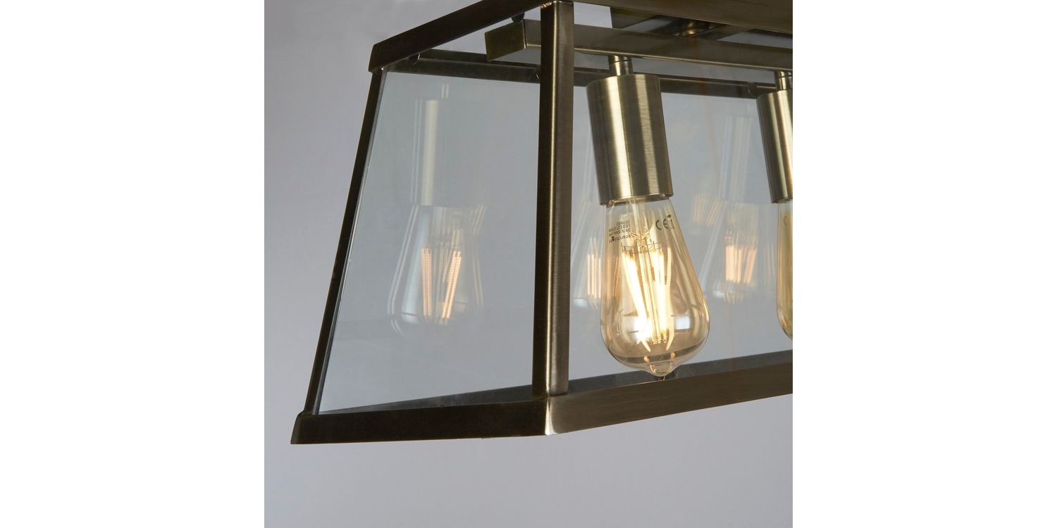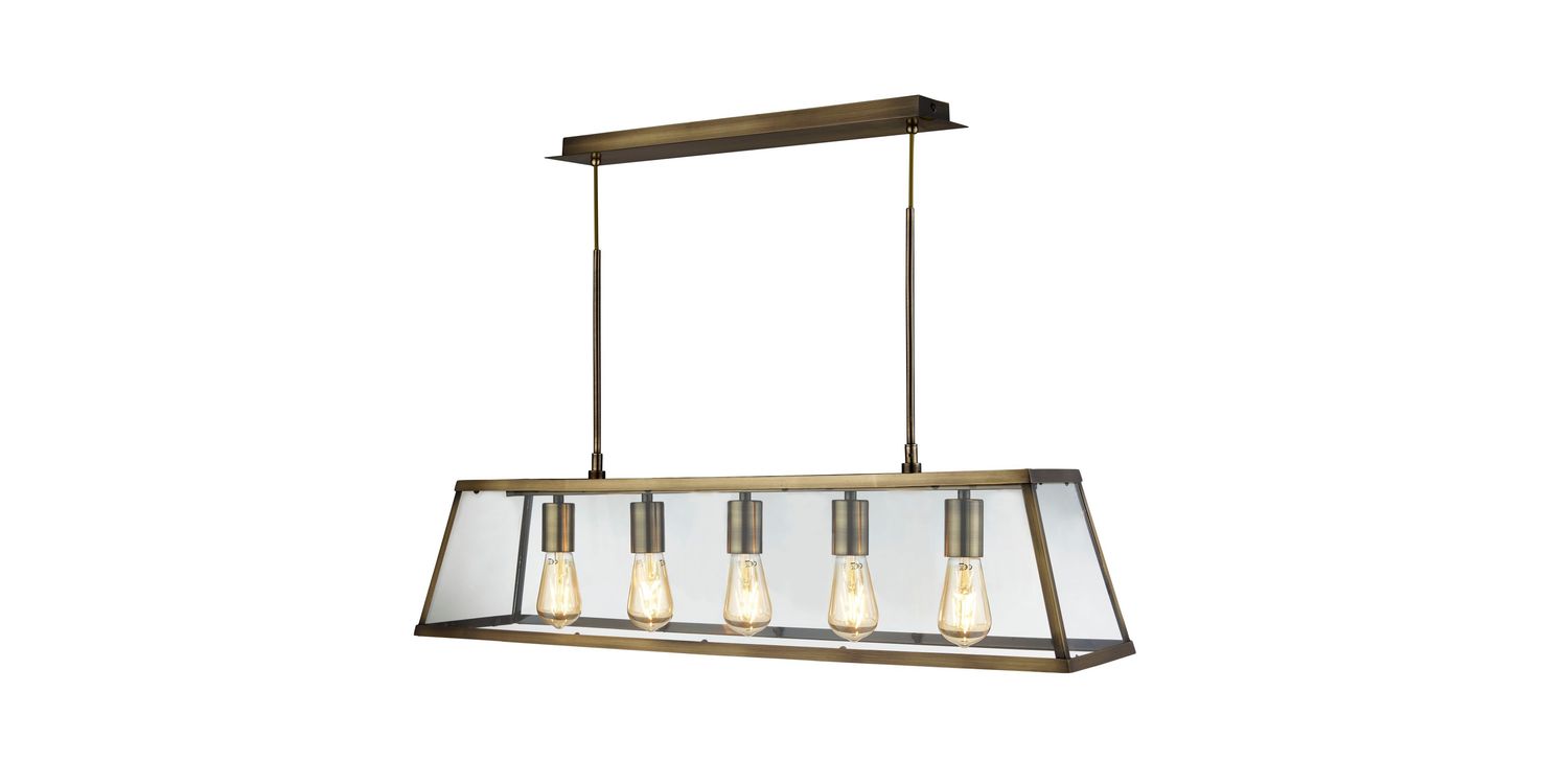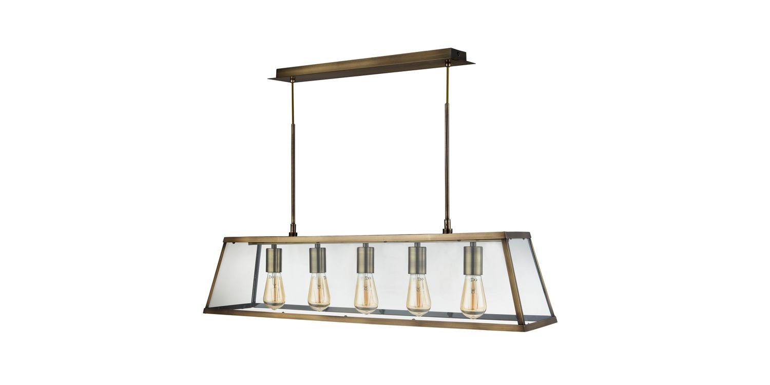 Creating the perfect statement in your home, our 5 light Voyager bar pendant is definitely one to keep on show. Made in a tasteful antique brass finish and clear glass shade, it creates a bold and decorative piece and makes a great addition to any type of living space. 1500mm H x 200mm W x 900mm L 1500mm Total Height Bulb Type- E27 Not included