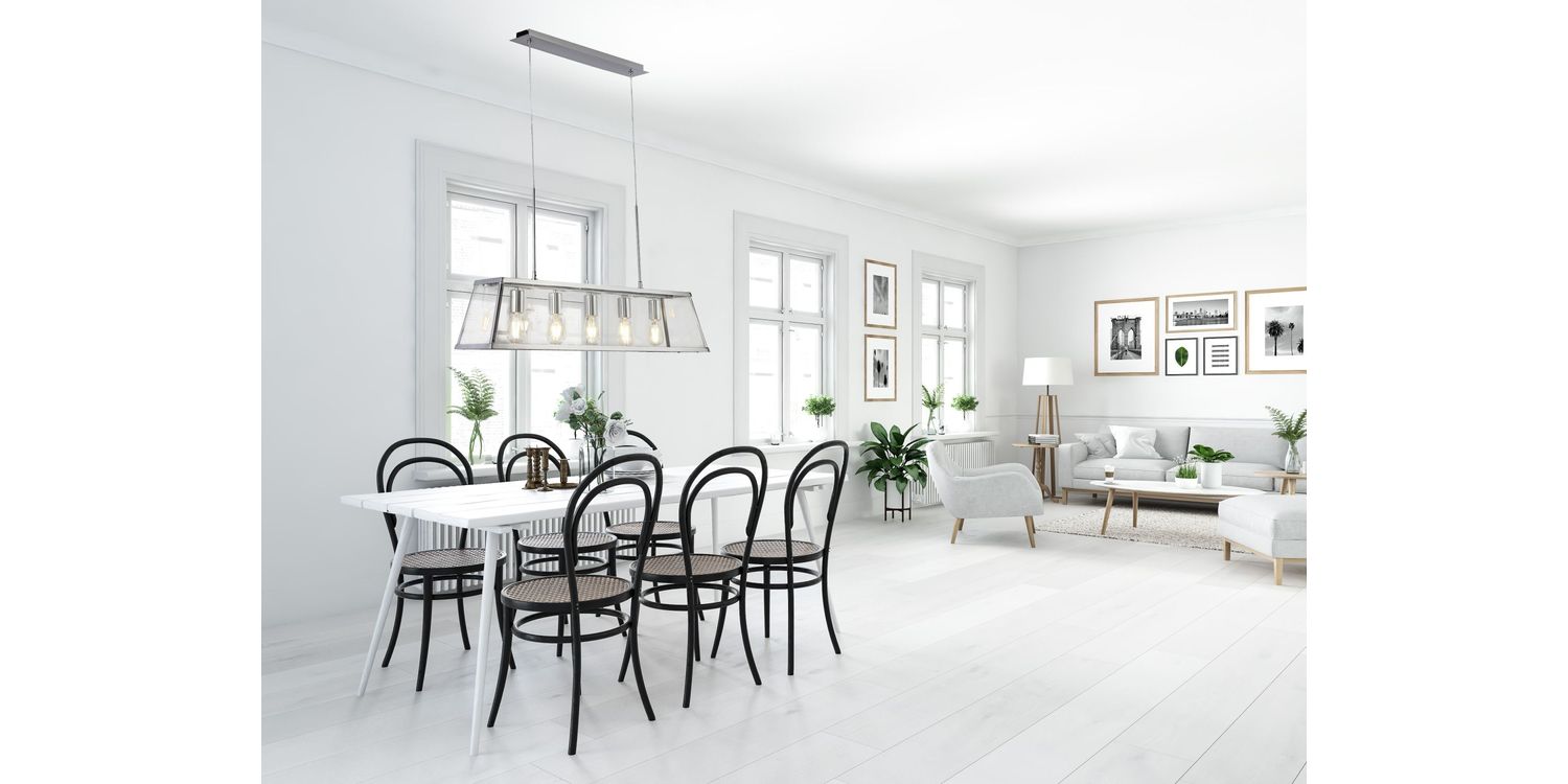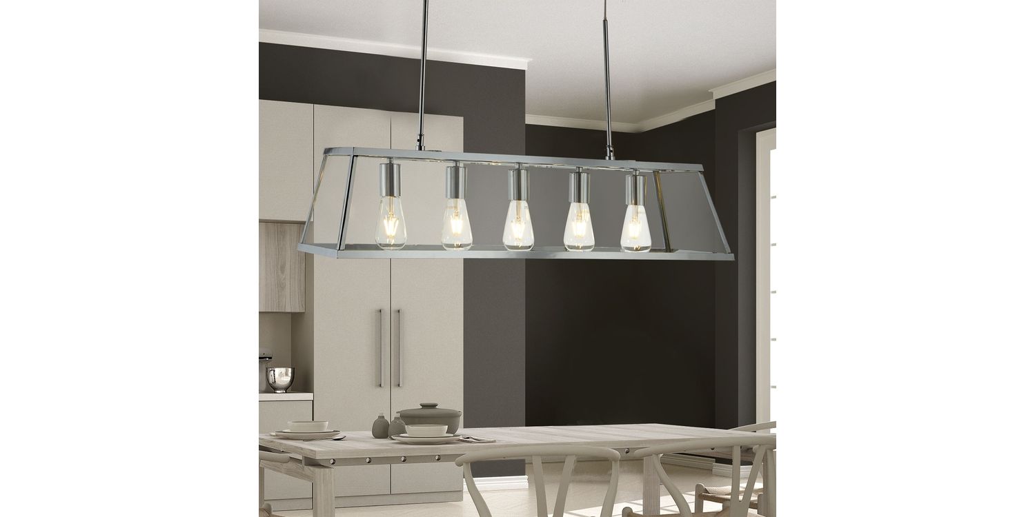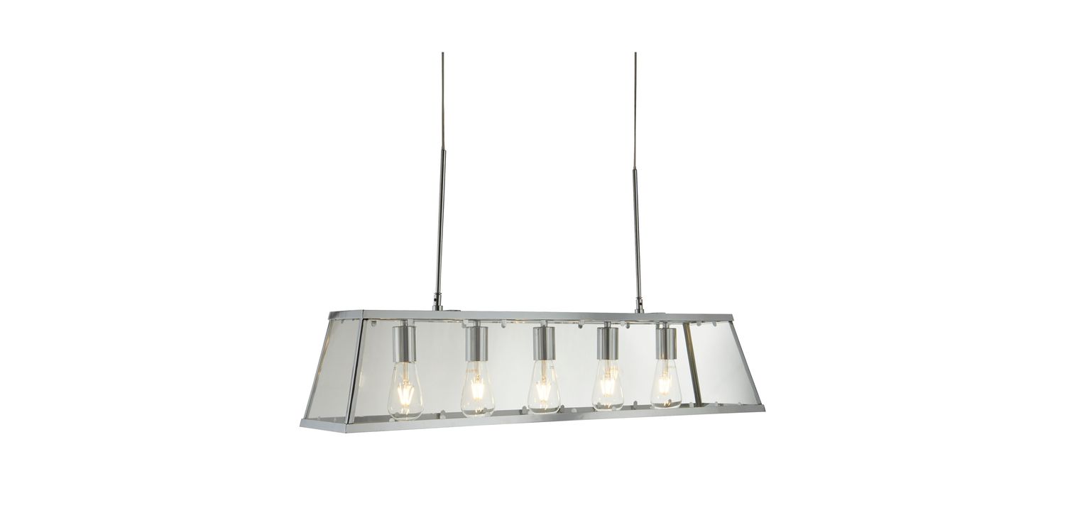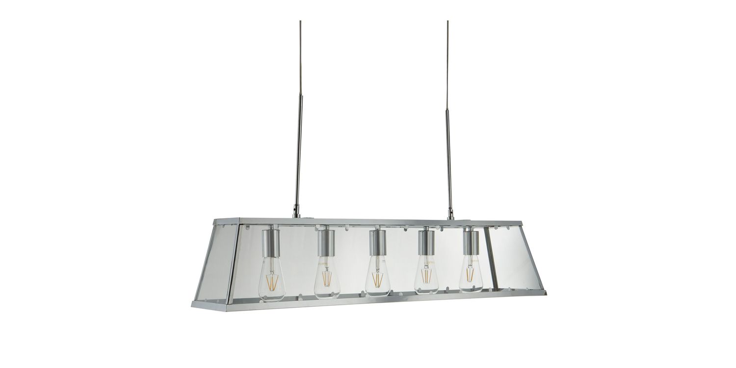 The Voyager clear glass bar pendant has a modern urban feel to it, and would be a welcome addition to any home. Exposed lamps create a modern edge and will ensure the item stands out; whereas the sleek chrome finish prism shaped frame creates a timeless appeal. Add to any contemporary lounge or hallway or hang low via the height adjustable suspension in any dining room or kitchen diner. This pendant can also fully convert to a flush creating a 2-in-1 product. 1500mm H x 200mm W x 900mm L 1500mm Total Height Bulb Type- E27 Not included