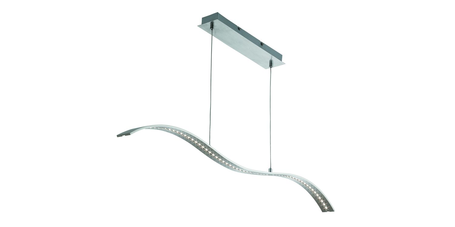 This satin silver LED wavy bar pendant with clear glass is a great feature for any modern dining room positioned centrally above the table or over a kitchen island or breakfast bar. The wavy, curved bar is suspended from the ceiling by two wire suspensions and finished in a stylish smooth satin silver. Illuminated by the latest energy saving LED technology, this unique, stylish LED bar pendant is ideal for any busy working environment of the home. LED's use up to 75% less energy and last up to 20 times longer than incandescent bulbs, making this pendant energy efficient as well as stylish. 1200mm H x 80mm W x 1000mm L 1200mm Total Height Bulb Type- LED Intergrated