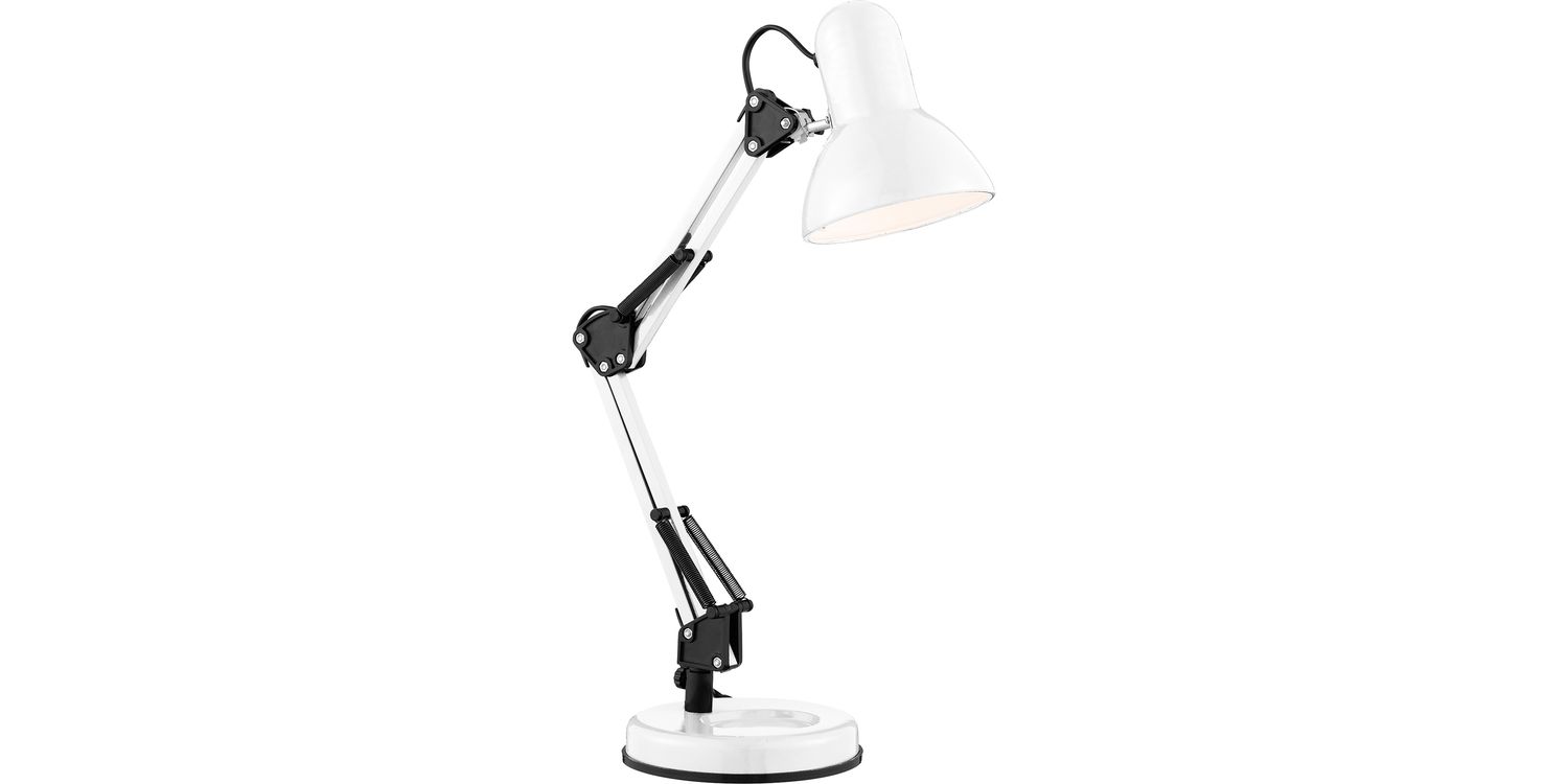 This retro, angled Desk Partners table lamp is styled on an iconic design and powder-coated in a shiny white colour. The hinged base, central column and cylindrical shade are fully adjustable, enabling you to direct the light just where it is needed. Ideal for use in a study room or a children's bedroom, contemporary desk lamps don't get more desirable. 530mm H x 150mm W 530mm Total Height Bulb Type- E27 Not included