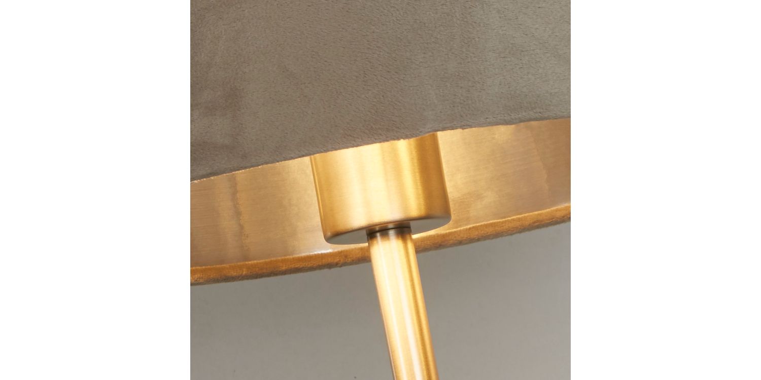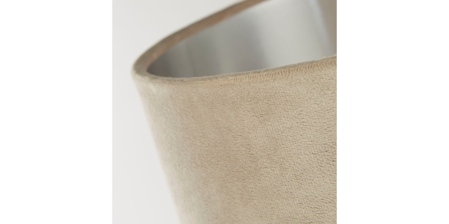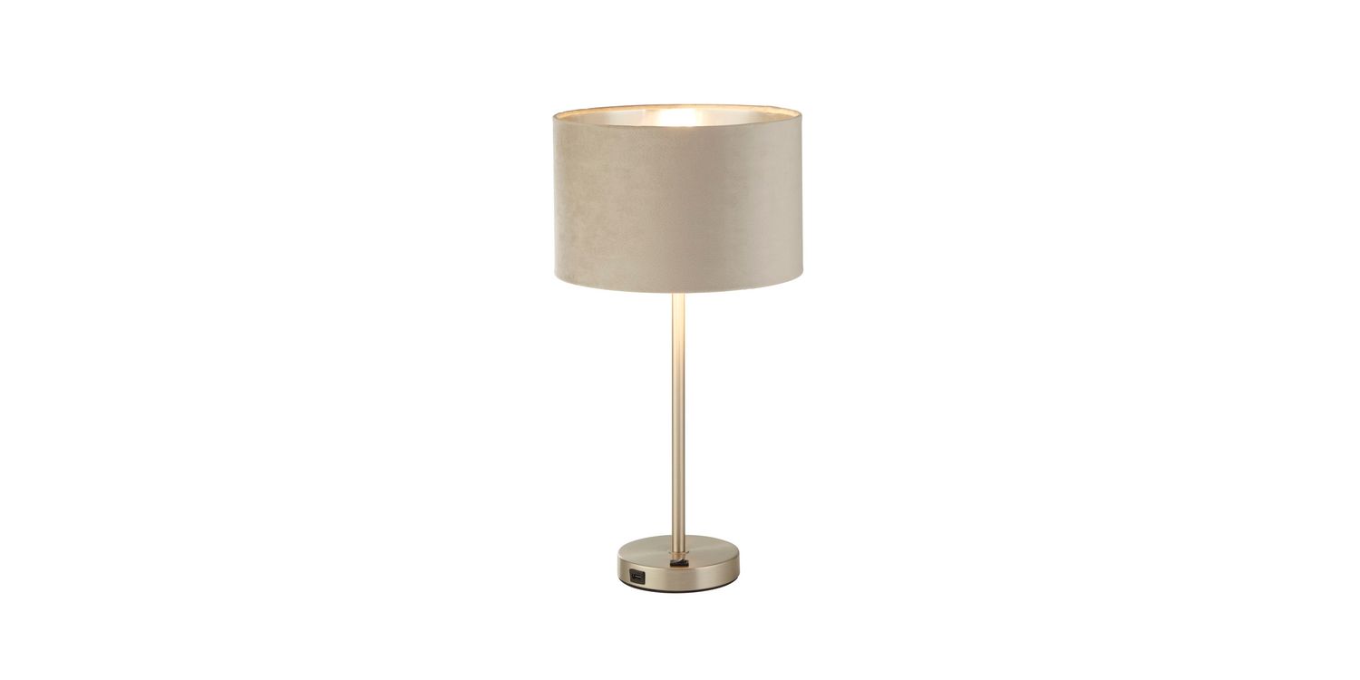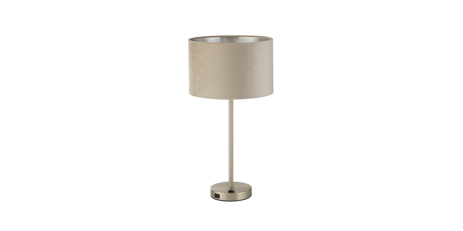 The Finn Table Lamp is the perfect combination of style and functionality. Crafted with high-quality materials, it showcases a satin nickel finish that adds a touch of elegance and sophistication to any room. The satin nickel colour exudes warmth and richness, creating a captivating focal point in your space. Topped with a luxurious taupe velvet shade with metallic silver inner, this lamp will be the perfect finishing touch to any living room or bedroom. Fitted with a USB-A 5V charging port in the base, this table lamp can also charge USB devices even when the lamp is switched off. 540mm H x 280mm W x 280mm L 540mm Total Height Bulb Type- E27 Not included