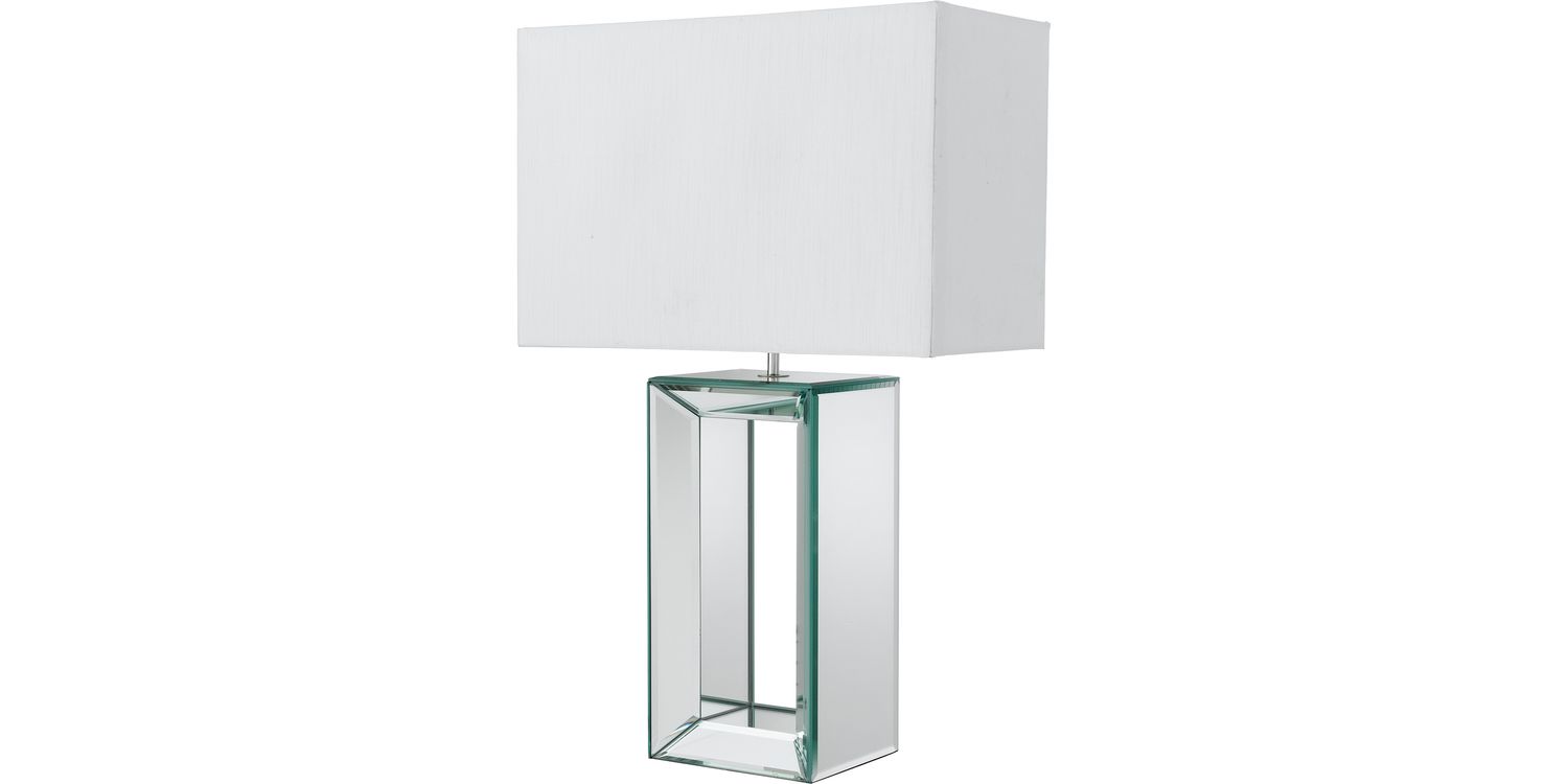 This tall table lamp features an eye-catching hollow mirror base and is paired with a rectangular faux silk white shade. The Mirror base adds a contemporary edge to the item. It's perfect for placing in a modern living room to both brighten and add style. 580mm H x 380mm W x 190mm L 580mm Total Height Bulb Type- E27 Not included