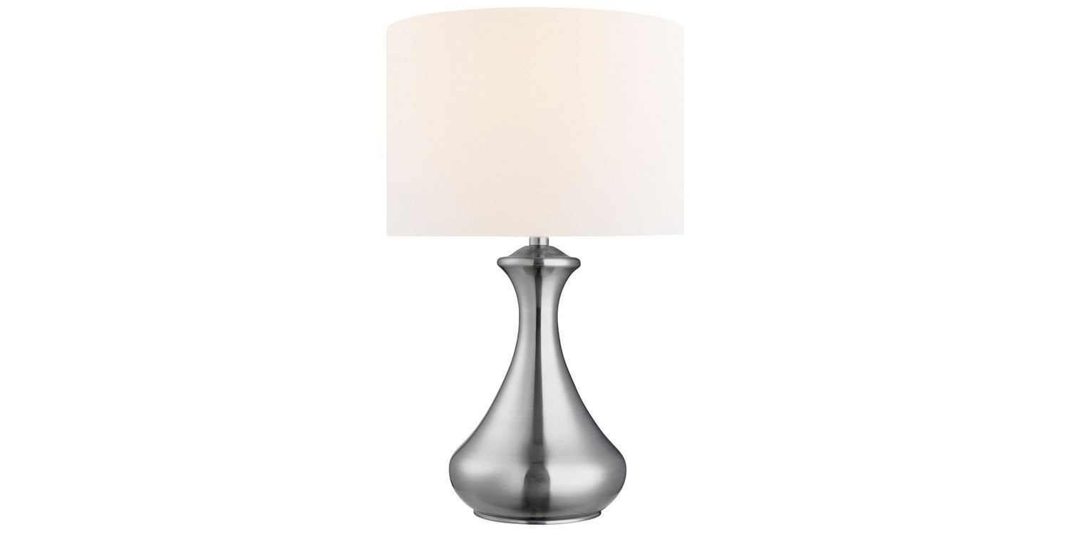 This Touch table lamp looks modern and stylish in any corner of your home. The sleek satin silver finish, curved base complements the understated white fabric shade making this table lamp a real statement lighting piece. It's also touch sensitive, with low, medium and high light settings, which is perfect for a bedside table in any bedroom. 400mm H x 240mm W x 240mm L 400mm Total Height Bulb Type- E14 Not Included