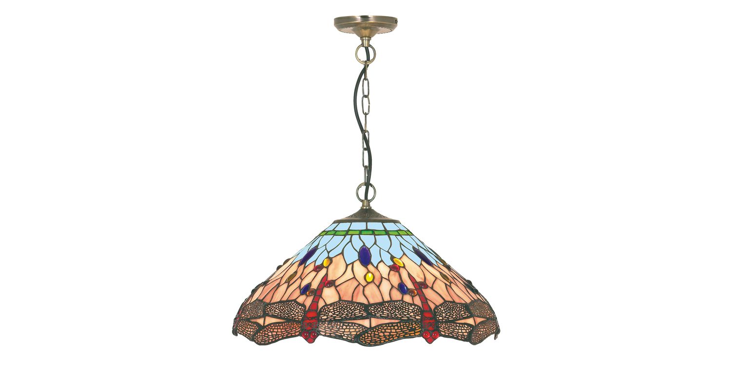 This classic Dragonfly Tiffany pendant light is inspired by early 20th century design, with an antique brass finish and hand-made Dragonfly Tiffany glass diffuser. The elegant finish is timeless, adding a touch of class to any ceiling, and the lighting effects from the coloured glass diffuser are visually stunning 1200mm H x 420mm W 1200mm Total Height Bulb Type- E27 Not included
