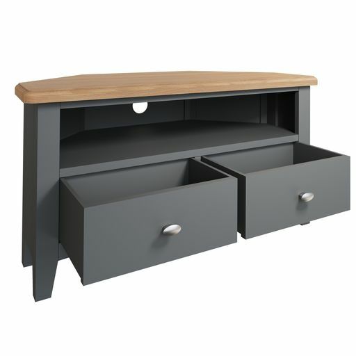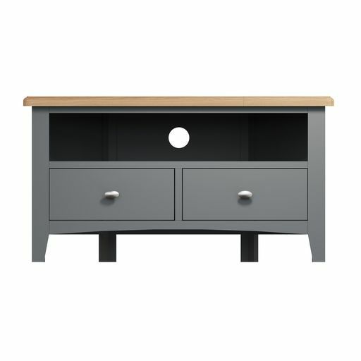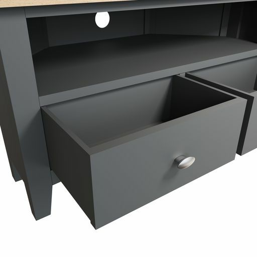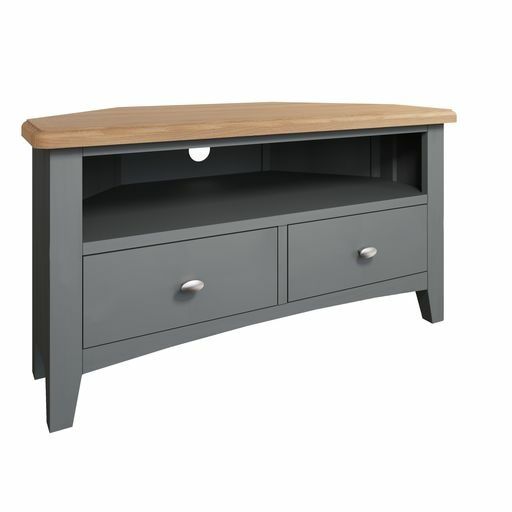 Devon Dining & Occasional Grey Corner TV Unit 90 x 44 x 48 cmThis fresh and beautiful collection offers both style and exceptional value for money, featuring bevel detailing to the tops and tapered legs, this collection features grey cabinets paired with light oak tops and brushed metal handles.Cable holes in back of unitRounded corners with bevel detailing and tapered legsReady assembled