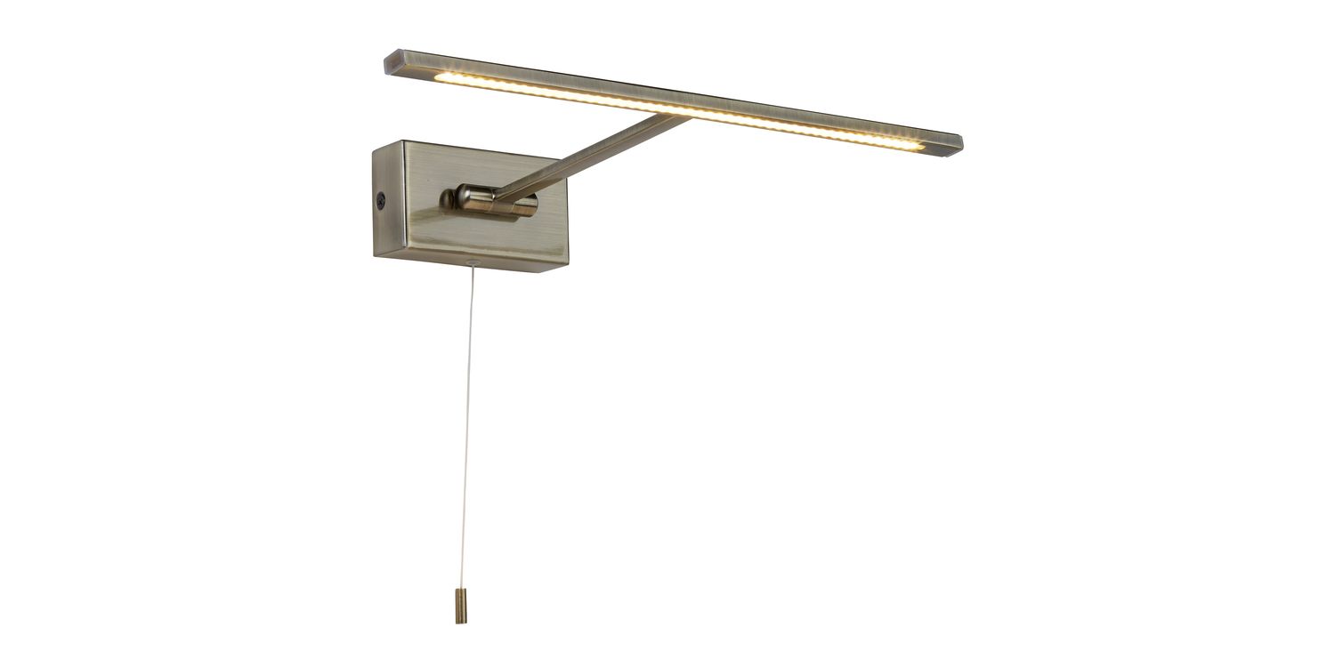 This Cadiz antique brass LED picture light will make a stylish addition to any wall to direct light on to pictures or for above the bed for reading. The compact wall attachment has a long, narrow 'T-shaped' head which is fully adjustable to direct light at just the right angle for any wall feature. The sleek reading light comes in a traditional antique brass finish and incorporates the latest energy saving LED technology to beautiful effect. Comes with white pull cord switch (not shown). LED's use up to 75% less energy and last up to 20 times longer than incandescent bulbs. 60mm H x 340mm W 60mm Total Height Bulb Type- LED Intergrated