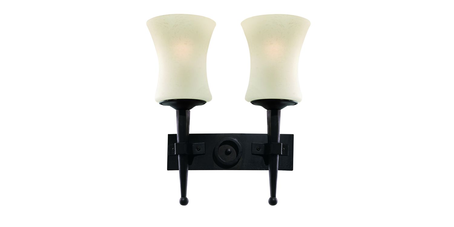 This Cartwheel 2 light wall bracket in black wrought iron and candle-inspired scavo glass shades lights up your bedroom, living room, dining room or kitchen walls beautifully. The wrought iron effect fitting is old English style, with two glass shades that produce a gentle lighting effect, so you can give you home a traditional look and feel. 340mm H x 310mm W 340mm Total Height Bulb Type- E27 Not included