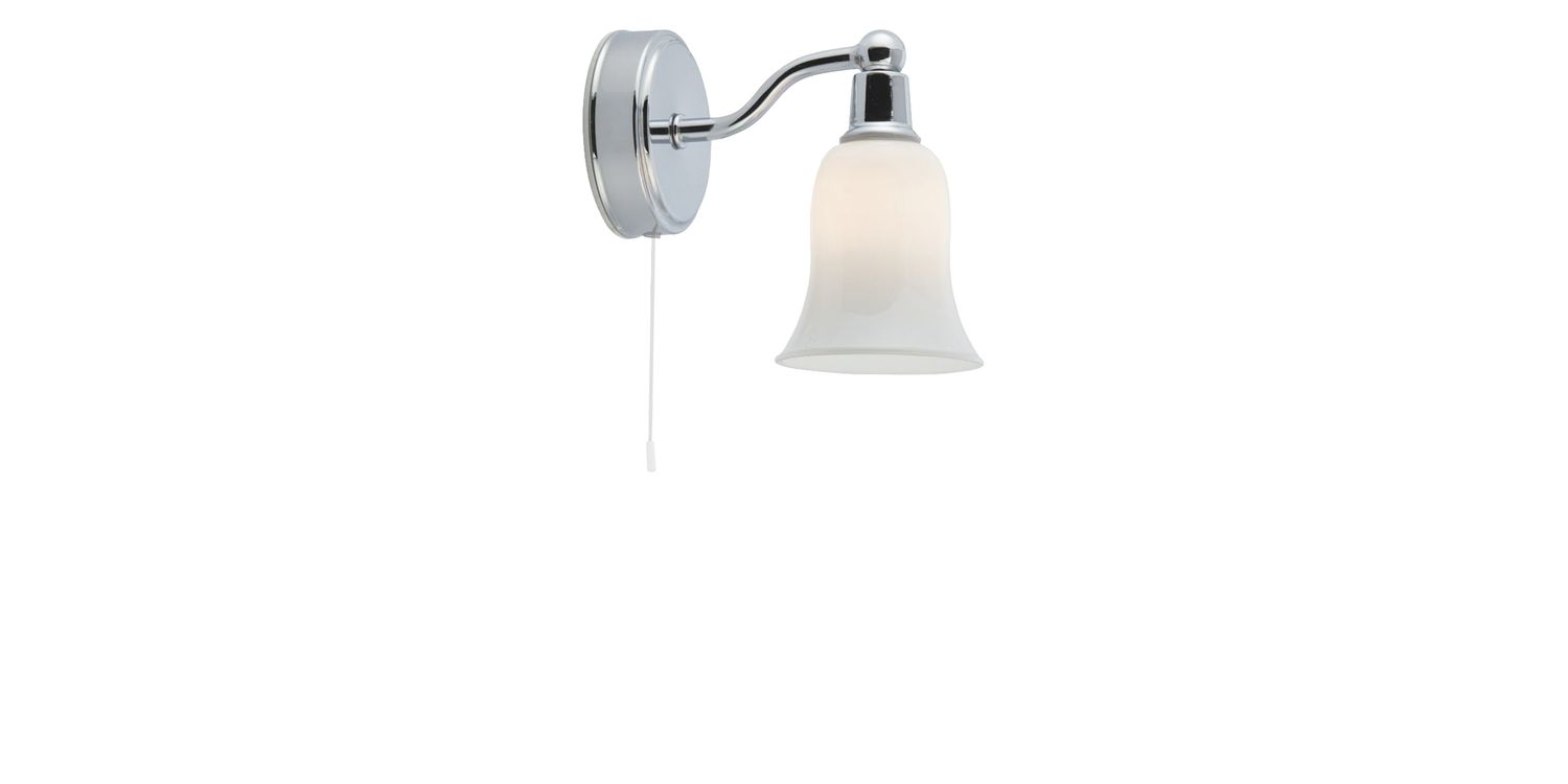 The Ecuador LED Bathroom Wall Light with bell-shaped white glass shade and pull cord switch is a modern take on a classic design. The handy pull cord is perfect for the bathroom, and the opal glass shade creates an elegant lighting effect. The fitting also has an attractive chrome finish, and it is IP44 rated and fully splashproof, complete with LED lamps. LED's use up to 75% less energy and last up to 20 times longer than incandescent bulbs.