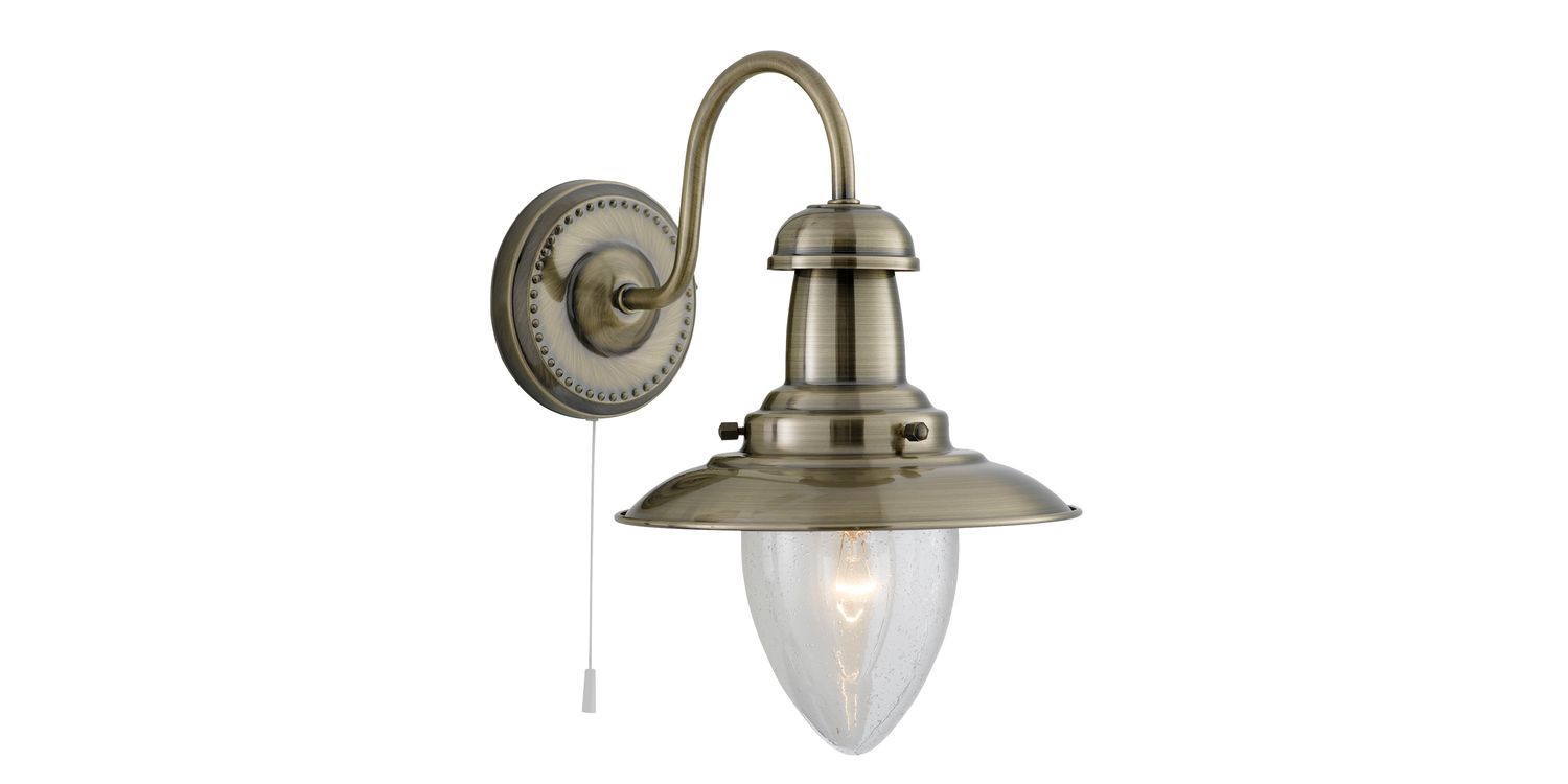 This Fisherman I antique brass wall light with oval seeded glass shade is a sturdy lantern with a classic, industrial style. Made with an old fashioned brass finish, it has smooth rounded edges and vintage style wall fitting, with an oval seeded glass shade which provides a stylish water droplet effect that will look at home in any traditional living space. It also comes with a handy pull cord switch. 260mm H x 180mm W 260mm Total Height Bulb Type- E27 Not included
