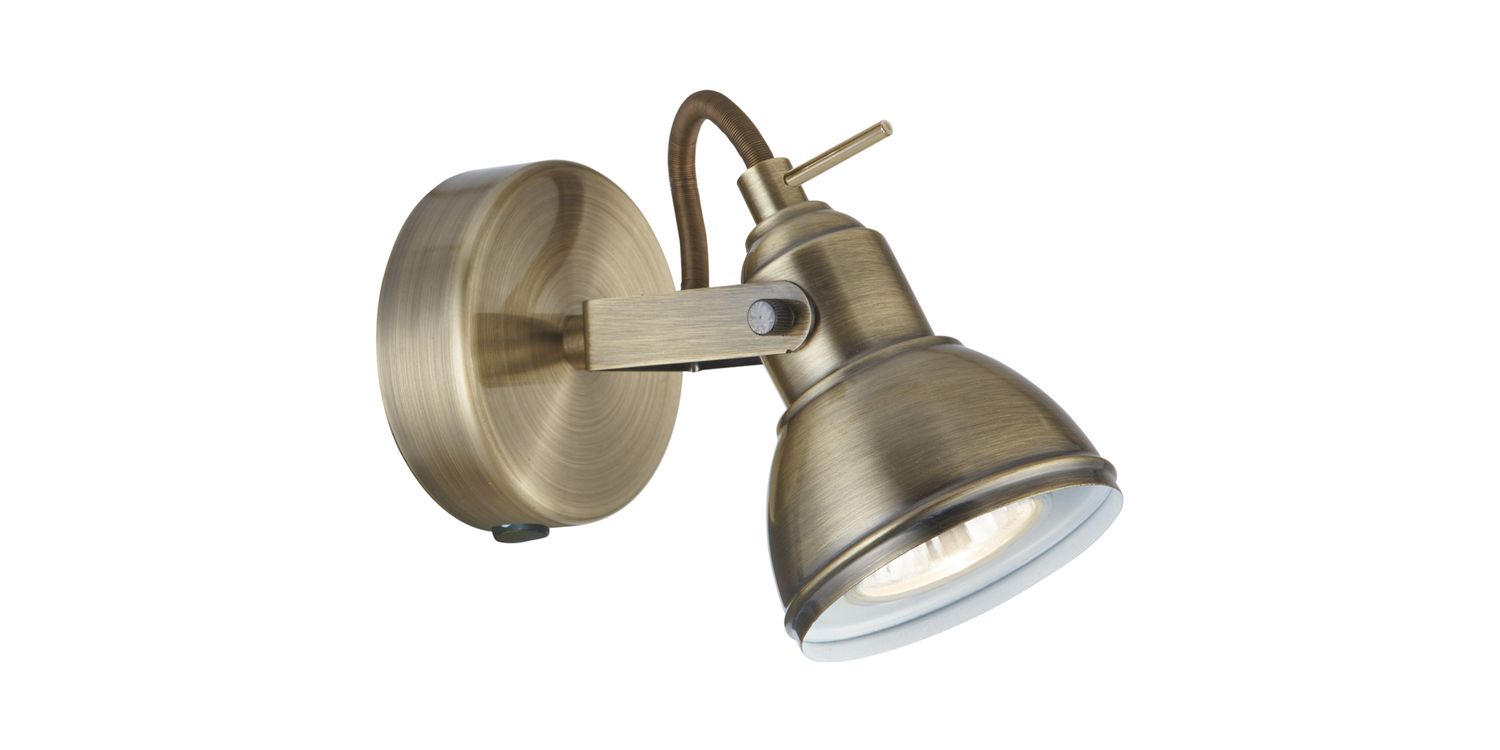 This Focus antique brass wall spotlight looks modern and attractive on any wall. The classic spotlight style fitting is fully adjustable and provides an additional source of light for any room of your home, and a stylish antique brass finish. The wall light also has a handy switch for ease of use. This product accepts a Max 7W LED or 50w Halogen GU10. 130mm H x 90mm W 130mm Total Height Bulb Type- GU10 Not Included