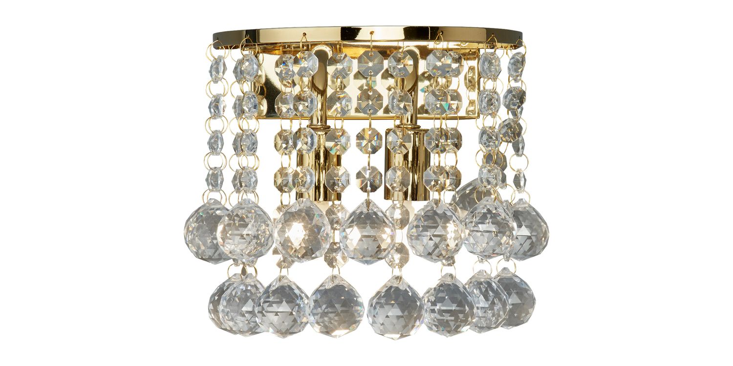 This Hanna gold 2 light round wall bracket with crystal balls looks stunning on any wall. The luxurious fitting features two lights surrounded by cascading crystal buttons and spheres, which hang decadently from a golden finished ring. This modern fitting looks beautiful by day or night. 180mm H x 180mm W x 180mm L 180mm Total Height Bulb Type- G9 Not Included